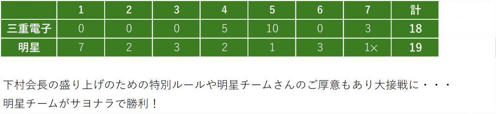 試合は、「明星チーム」と「三重電子チーム」の2つのグループに分けて行いました。当初5イニングで終了予定でしたが、白熱のゲーム展開での盛り上がりもあり7イニングまで延長となりました。
